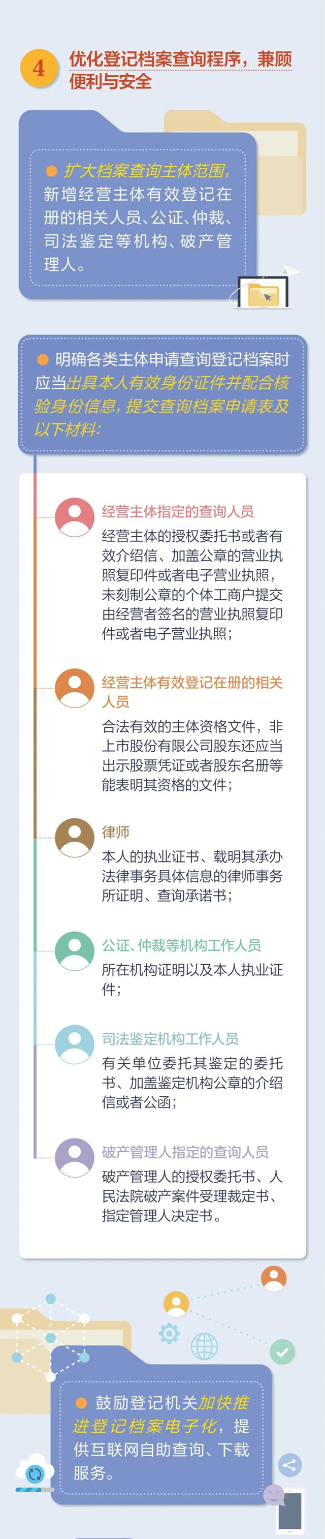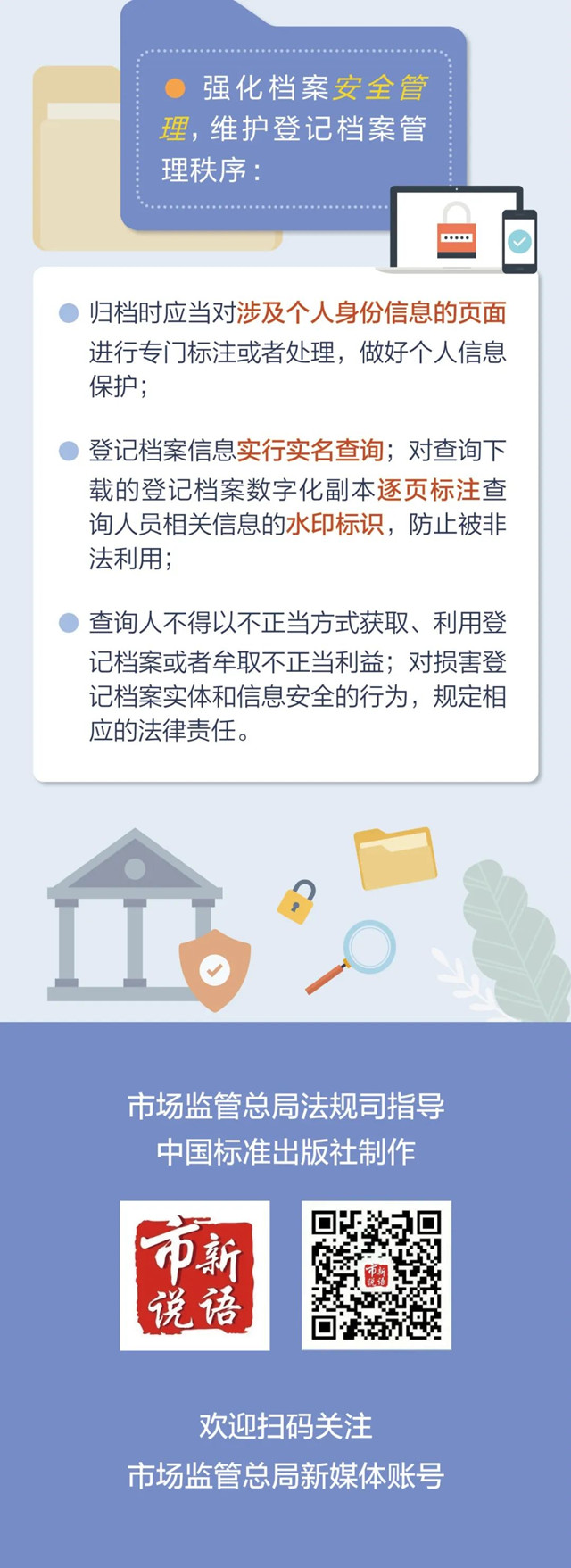 四是优化登记档案查询程序,兼顾便利与安全。根据社会实际需求,《办法》扩大登记档案查询主体范围,新增经营主体有效登记在册的相关人员、公证、仲裁、司法鉴定等机构、破产管理人,并明确各类主体申请查询时需要提供的材料。鼓励登记机关加快推进登记档案电子化,提供互联网自助查询、下载服务。在便利档案查询与利用的同时,着力做好登记档案安全管理。《办法》明确要求归档时应当对涉及个人身份信息的页面进行专门标注或者处理,做好个人信息保护;明确登记档案信息实行实名查询;对查询下载的登记档案数字化副本逐页标注查询人员相关信息水印标识,防止被非法利用;规定查询人不得以不正当方式获取、利用登记档案或者牟取不正当利益;对损害登记档案实体和信息安全的行为,规定相应的法律责任。