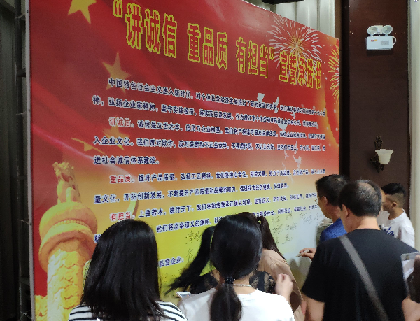 新当选会长漆梅芳向全市个体私营经济经营者提出“讲诚信、重品质、有担当”倡议,并带头在承诺书上签字。