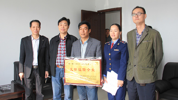 谷城县组织部组织科科长徐朝辉(右一)、县工商局丁彦清副局长(左二)、邓书义秘书长(左一)为市级文明诚信企业授牌。