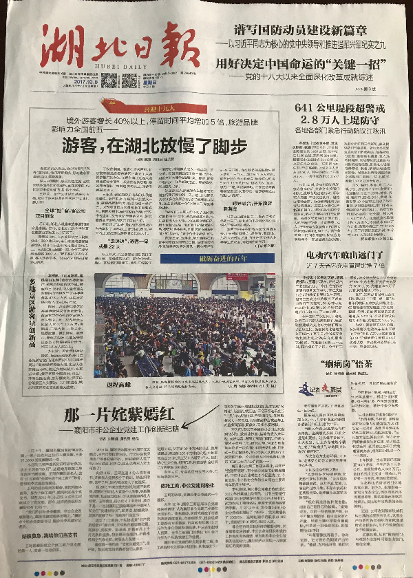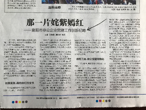 10月2日、8日,《湖北日报》头版连续两天刊登了襄阳市工商局、个私协开展非公党建的工作经验。