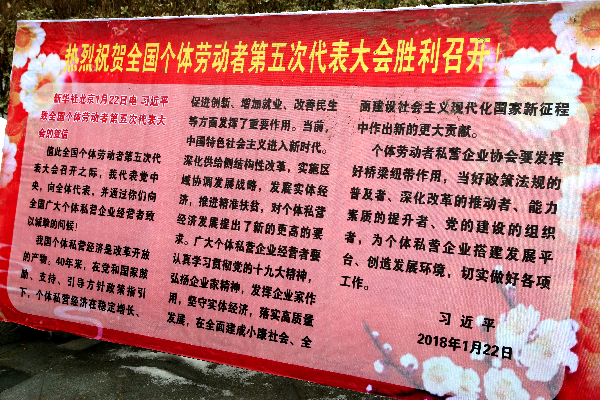 1月25日,数九寒天里,荆门市个体劳动者私营企业协会如期举办2018年迎春文艺晚会。会场两侧以标语形式张贴了习近平总书记致全国个体劳动者第五次代表大会贺信和李克强总理批示。
