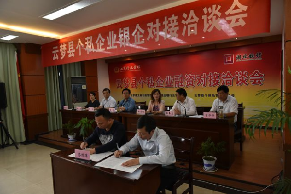 9月28日,云梦县个私协会、县工商局联合县湖北银行在县工商局七楼会议室召开了“银企融资对接”洽谈会。云梦县政府副县长涂兵、云梦县金融办主任蔡本友、市个私协会、市湖北银行等单位负责人亲临现场指导。当天共有 47家个私企业代表参会,现场达成融资协议5份,为企业融资4700万元。