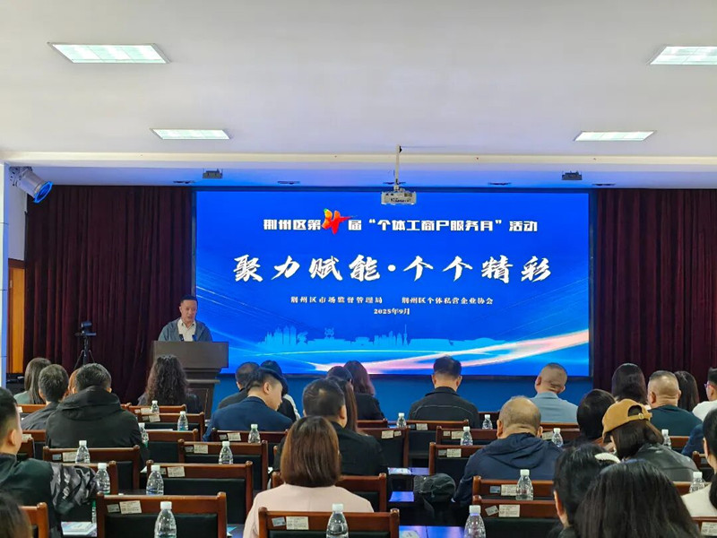 按照湖北省、荆州市市场监管局及省、市个私协会关于开展“全国第四届个体工商户服务月活动”(以下简称“服务月”)的工作部署,9月25日上午,荆州区市场监管局与荆州区个私协会联合举办了以“聚力赋能、个个精彩”为主题的第四届“个体工商户服务月”系列活动。荆州区市场监管局党组书记、局长李青云,党组副书记、副局长吴又青,区扶持个体工商户发展联席会议成员单位分管领导,区市场监管局行政审批股长、各市场监管所相关工作人员,荆州区个私协会会长、理事会班子成员,及全区68位“名特优新”个体工商户代表共计120人,在荆州区市场监管局三楼会议室共同参加了此次活动。