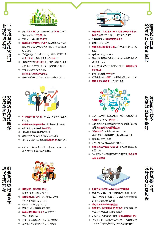 刚刚过去的2019年,极不平凡,极不容易。习近平总书记第三次视察湖北,更有力激发我们感恩奋进的澎湃热情。欢庆新中国70华诞,更有力激荡我们同心筑梦的硬核力量。一年来,在省委坚强领导下,我们坚持以习近平新时代中国特色社会主义思想为指导,增强“四个意识”,坚定“四个自信”,做到“两个维护”,全面贯彻党的十九大和十九届二中、三中、四中全会精神,深入落实习近平总书记视察湖北重要指示,笃定实干、克难攻坚,较好完成了全年经济社会发展目标任务。这一年,我们遇到的困难比预料的多、挑战比预想的大,但取得的成效比预期的好,许多方面具有重要的标志性意义。
