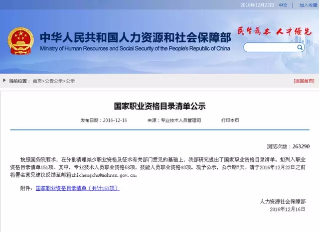 2016年12月16日,人力资源和社会保障部公示了国家职业资格目录清单,拟列入职业资格目录清单151项。其中,专业技术人员职业资格58项,技能人员职业资格93项。