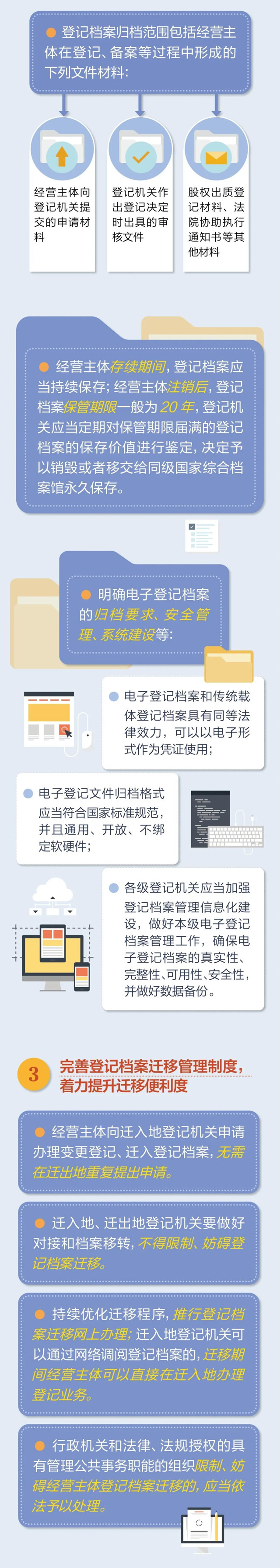 为加强经营主体登记档案的规范化管理,有效保护和利用登记档案,便利经营主体跨区域迁移,2月10日,市场监管总局和国家档案局联合制定出台《经营主体登记档案管理办法》(以下简称《办法》),将于2025年3月20日正式施行。